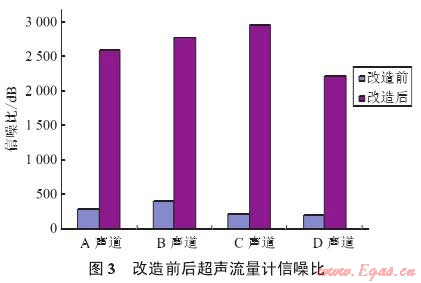 (3)由于在超聲流量計(jì)與調(diào)壓閥之間安裝了T形管件和90°彎頭,且工藝管道埋地后相當(dāng)于增大了流量計(jì)與調(diào)壓閥之間的管道距離,干擾噪音明顯降低,超聲流量計(jì)運(yùn)行狀況正常、穩(wěn)定。利用Daniel CUI軟件對(duì)超聲流量計(jì)進(jìn)行現(xiàn)場(chǎng)診斷后發(fā)現(xiàn):超聲換能器信號(hào)質(zhì)量均為100%,信噪比SNRs均超過2000(圖3)。