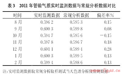 (2)在線色譜分析儀安裝投運(yùn)后,為驗(yàn)證該臺(tái)色譜儀實(shí)際運(yùn)行效果,從2011年8月開始,對(duì)色譜儀氣質(zhì)實(shí)時(shí)監(jiān)測(cè)數(shù)據(jù)和常規(guī)取樣分析數(shù)據(jù)進(jìn)行對(duì)比(表3)。從投運(yùn)7個(gè)月的天然氣相對(duì)密度對(duì)比情況來看,實(shí)時(shí)監(jiān)測(cè)數(shù)據(jù)與常規(guī)監(jiān)測(cè)數(shù)據(jù)最大偏差出現(xiàn)在12月,為0.28%,其余月份偏差較小。除儀器固有分析誤差和常規(guī)分析時(shí)產(chǎn)生的泄漏等人為或器械故障原因?qū)е鲁霈F(xiàn)不可克服的分析偏差外,色譜儀實(shí)時(shí)監(jiān)測(cè)數(shù)據(jù)運(yùn)行總體保持平穩(wěn)。根據(jù)實(shí)時(shí)監(jiān)測(cè)數(shù)據(jù)變動(dòng)情況可知,10月初因下游用氣需求發(fā)生較大變化,期間壓減了某一氣源的日接氣量,導(dǎo)致相對(duì)密度變化較大。此時(shí)如果采用常規(guī)分析檢測(cè)手段將無法實(shí)時(shí)反映這種氣質(zhì)變化,從而導(dǎo)致產(chǎn)生較大計(jì)量偏差。而安裝在線色譜儀后,可以實(shí)時(shí)采集到管道內(nèi)的最新氣體組分,便于在上游進(jìn)行流程切換時(shí),及時(shí)掌握氣質(zhì)變化情況,提高了計(jì)量精度[3]。