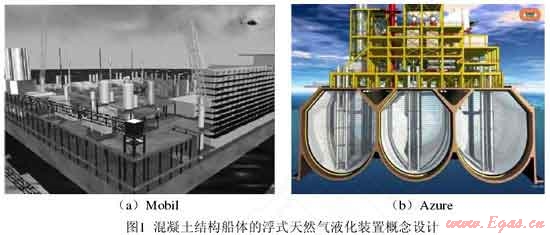 最初,FLNG 概念設(shè)計(jì)采用混凝土制造船體,在其上放置球形、圓柱形或薄膜型 LNG 儲(chǔ)艙?;炷翚んw吃水深,承載能力大,具有低溫性能好、不易老化的優(yōu)點(diǎn),但是這種結(jié)構(gòu)的船身笨重,遷移和錨泊將是巨大的挑戰(zhàn)。代表性的 FLNG 概念設(shè)計(jì)有:Mobil 公司的 Floating LNG 和 Bouygues Offshore 公司的 Azure項(xiàng)目(圖1)。