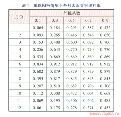 ①單純考慮太陽直射輻射時,單遮陽板的外挑系數(shù)宜控制在0.3左右。