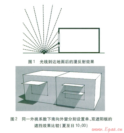 室內(nèi)的采光和視野。同一外挑系數(shù)下南向外窗分別設(shè)置單、雙遮陽板的遮擋效果比較(夏至日10:O0)見圖2。由圖2可知,設(shè)置雙遮陽板也能加強(qiáng)對直射光的遮擋。當(dāng)直射光從非正南入射時,第二遮陽板能夠有效地削弱進(jìn)入室內(nèi)的太陽直射光,并且能將投射到下遮陽板的直射光以漫反射的形式投射到室內(nèi)深處,加強(qiáng)室內(nèi)深處的采光效果。