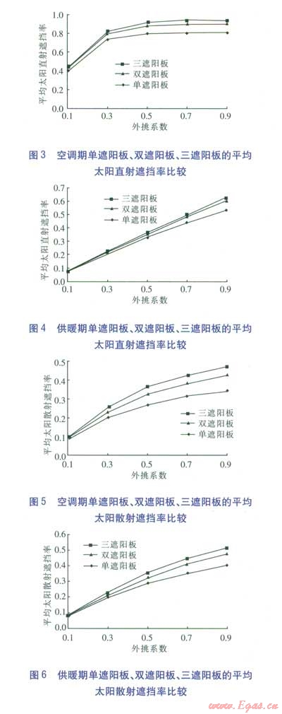 研究內(nèi)容包括:單遮陽板適宜的外挑系數(shù);多遮陽板(包括雙遮陽板、三遮陽板)與單遮陽板的性能比較;遮陽板對照明電耗的影響;多遮陽板對室內(nèi)采光的影響。