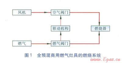 全預混商用燃氣灶具的燃燒系統(tǒng)主要包括:全預混燃燒器、燃氣閥門、空氣閥門、風機、管道、聯(lián)動機構等,見圖l。其中聯(lián)動機構是以燃氣閥門的開度為信號,對空氣閥門進行開度控制,有機械傳動與電子傳動兩種方式。