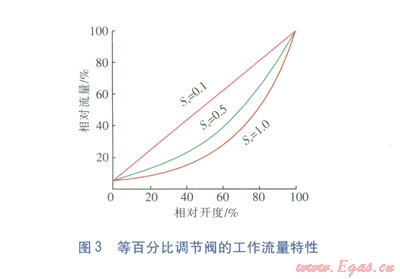 實際使用時,調節(jié)閥安裝在具有一定阻力的管道上。閥門開度變化在改變流量的同時也改變管道的阻力,因此在同一開度下,通過調節(jié)閥的實際相對流量與理想流量有一定偏差。通過調節(jié)閥的實際流量與相對開度的特定關系稱為閥門的工作流量特性,關系式見式(2)。等百分比調節(jié)閥的工作流量特性見圖3。