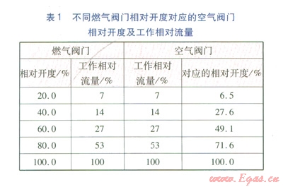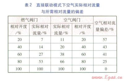 由以上關系式,還可得到燃氣閥門與空氣閥門直接聯(lián)動,空氣的實際相對流量與所需相對流量的偏差,見表2。