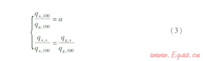 欲使全預混商用燃氣灶具的實際空燃比值等于設計空燃比值。,選用的閥門應該滿足兩個條件:第一,兩閥門都在最大開度下,實際空氣流量qa,l00等于實際燃氣流量qg,l00的a倍;第二,燃氣閥門相對開度減小后,調節(jié)空氣閥門的相對開度,能夠保證空氣閥門的相對流量值等于燃氣閥門的相對流量值。即: