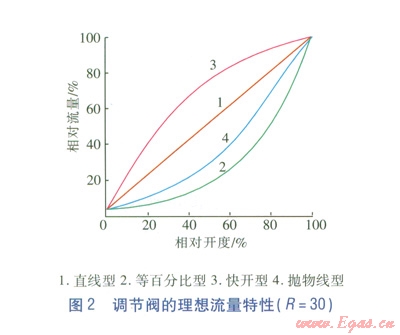 常見的調節(jié)閥理想流量特性有直線流量特性、等百分比流量特性、快開流量特性和拋物線流量特性4種類型,見圖2。