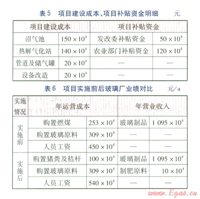 根據(jù)項(xiàng)目改造需要,在玻璃廠原有生產(chǎn)設(shè)備基礎(chǔ)上,需要修建沼氣池、熱解氣化站、儲(chǔ)氣罐等設(shè)施,應(yīng)列入建設(shè)成本。由于該項(xiàng)目符合國家政策中著力進(jìn)行綠色能源縣以及新農(nóng)村建設(shè)的思路,可得到發(fā)改委以及農(nóng)業(yè)部門的財(cái)政補(bǔ)貼。結(jié)合企業(yè)自籌資金,項(xiàng)目改造具有充分的經(jīng)濟(jì)保證。項(xiàng)目建設(shè)成本、項(xiàng)目補(bǔ)貼資金明細(xì)見表5,項(xiàng)目實(shí)施前后玻璃廠業(yè)績(jī)對(duì)比見表6。項(xiàng)目實(shí)施前的人員數(shù)量為100人,實(shí)施后新增崗位30個(gè)。