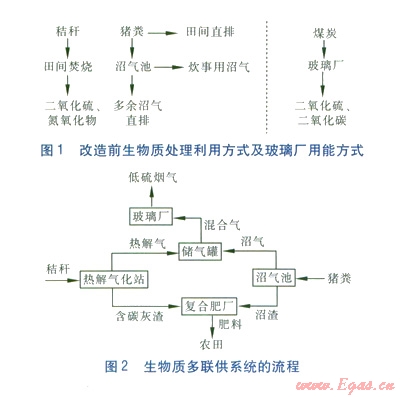 湘潭縣某玻璃廠生產(chǎn)能耗巨大,燃煤成本占年運(yùn)營成本的25%,生產(chǎn)過程中排放大量S02、C02。經(jīng)調(diào)研發(fā)現(xiàn),湘潭縣被譽(yù)為“全國養(yǎng)豬第一縣”,該玻璃廠所在村莊建有130多口沼氣池,主要以當(dāng)?shù)氐呢i糞為原料,產(chǎn)生的沼氣除部分用于炊事外,其他均排至大氣。另外,由于豬糞產(chǎn)量巨大,在滿足沼氣池使用之外仍有過剩豬糞直排田間,在開放環(huán)境下產(chǎn)生甲烷、二氧化碳等。據(jù)初步估算,外排沼氣和過剩豬糞每年向環(huán)境排放的溫室氣體折合成二氧化碳約2 800 t/a。當(dāng)?shù)赜袊壹?jí)超級(jí)水稻大規(guī)模推廣基地,目前村民大多采用田間焚燒的方法處理秸稈,大量生物質(zhì)能被浪費(fèi),排放大量二氧化硫及氮氧化物。