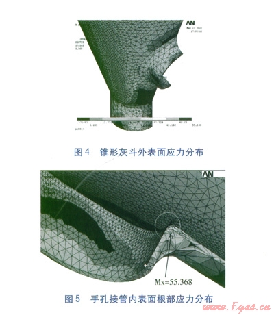 ANSYS提供了變形、應(yīng)力、應(yīng)變、能量等云圖顯示。錐形灰斗外表面應(yīng)力分布見(jiàn)圖4。手孔接管內(nèi)表面根部應(yīng)力分布見(jiàn)圖5。由圖4、5可知,最大當(dāng)量應(yīng)力位于手孔接管內(nèi)側(cè)的圓角過(guò)渡處,在設(shè)計(jì)壓力為0.28MPa時(shí),最大當(dāng)量應(yīng)力為55.37MPa。