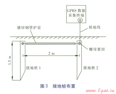 接地系統(tǒng)包括浪涌保護(hù)、跨接和接地3部分。浪涌保護(hù)器有電源線路SPD和信號(hào)線路SPD兩種規(guī)格,分別接在數(shù)據(jù)采集終端開關(guān)電源進(jìn)出總線上和流量計(jì)RS485信號(hào)總線上。