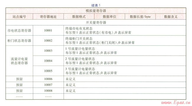 完整的遠(yuǎn)傳抄表數(shù)據(jù)包內(nèi)有兩種類型的數(shù)據(jù),一種是模擬量數(shù)據(jù),如流量、壓力、溫度等,通過內(nèi)部控制模塊轉(zhuǎn)換成數(shù)字量數(shù)據(jù);另一種是狀態(tài)信號(hào)數(shù)據(jù),如市電狀態(tài)、采集終端柜門狀態(tài)等開關(guān)量數(shù)據(jù)。GPRS數(shù)據(jù)采集格式見表l。