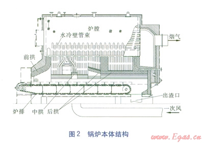 后拱的設(shè)計應(yīng)使火床的強烈燃燒區(qū)處于后拱的拱區(qū)內(nèi),并具有足夠的覆蓋率、容積高度,其長度和高度比燃煤鍋爐有所增加,后拱出口應(yīng)有一個水平或向下的拱段。