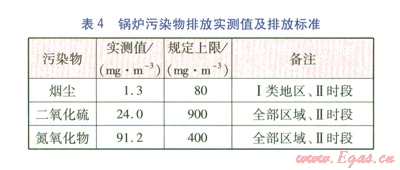 經(jīng)環(huán)保部門檢測,鍋爐污染物排放實測值及規(guī)定上限見表4。執(zhí)行標(biāo)準(zhǔn)為GB l3271-2001《鍋爐大氣污染物排放標(biāo)準(zhǔn)》。由表4可知,各項污染物排放指標(biāo)符合要求。