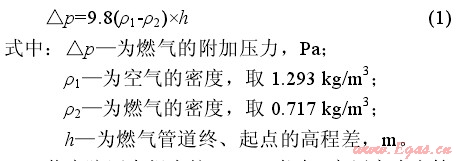 民用天然氣燃具的額定壓力pn=2000Pa,燃具前壓力應在(0.75~1.5)pn范圍內(nèi)波動(參見《城鎮(zhèn)燃氣設計規(guī)范》(GB50028—2006))。當天然氣壓力超出此范圍,燃具的熱效率降低,燃燒不穩(wěn)定,燃燒噪聲大,出現(xiàn)脫火或者回火等現(xiàn)象。目前,安陽市高層建筑的燃氣設計主要采用低壓入戶,在計算低壓燃氣管道的壓力損失時,應考慮因建筑高度而引起的燃氣附加壓力△p,計算如下: