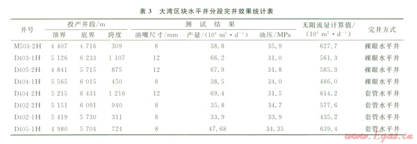 上述完井管柱應(yīng)用于大灣區(qū)塊4口裸眼水平井和4口套管水平井的分段完井投產(chǎn)作業(yè),完井管柱下入順利,作業(yè)過(guò)程安全可控,首次實(shí)現(xiàn)了國(guó)內(nèi)高含硫水平井分段改造,儲(chǔ)層改造施工安全順利,增產(chǎn)效果明顯(表3)。