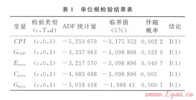 表1中,檢驗(yàn)類型(c,T,d)分別代表所檢驗(yàn)的序列中含有截距、時(shí)間趨勢(shì)以及滯后階數(shù);按AIC準(zhǔn)則確定滯后階數(shù)。結(jié)果表明,CPI、GGDP、Eprice、Cprice、Gprice的水平值都是非平穩(wěn)的,但其一階差分是平穩(wěn)的(ADF檢驗(yàn)即增廣迪基-福勒檢驗(yàn),其統(tǒng)計(jì)量的絕對(duì)值大于臨界值的絕對(duì)值,表示變量平穩(wěn)),因此,這5個(gè)變量序列都是在95%置信水平下的一階單整序列[表