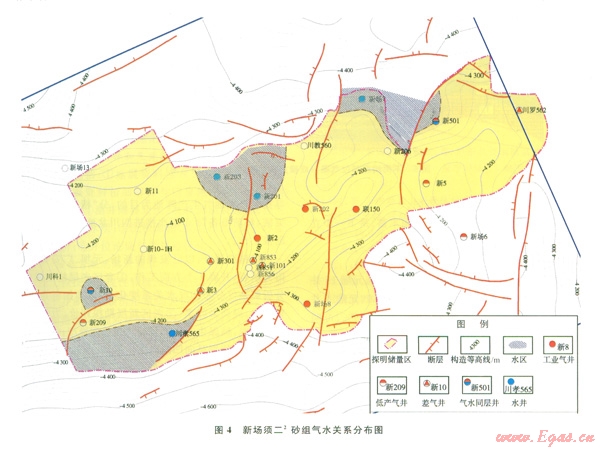 圖4顯示,新場(chǎng)氣田須二2砂組在氣藏較高部位還存在局部水區(qū),在南北均存在邊水且各井區(qū)氣水界面不同,這些現(xiàn)象充分說明氣藏沒有統(tǒng)一的氣水關(guān)系。