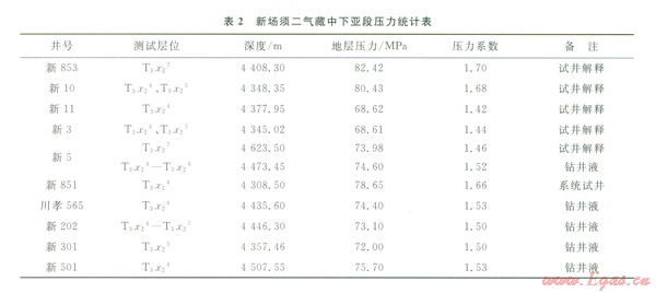 新場(chǎng)氣田須二段氣藏中下亞段共有11個(gè)測(cè)試數(shù)據(jù),計(jì)算的地層壓力如表2所示。從表2中可以看出,壓力系數(shù)在1.42~1.70之間一個(gè)較大范圍內(nèi)變化,總體表現(xiàn)出不同目標(biāo)區(qū)(或裂縫體系)壓力系數(shù)不同,如中部裂縫體系壓力系數(shù)高(新851井須二4亞段壓力系數(shù)l.66,新853井壓力系數(shù)1.70),而該裂縫體系以西地區(qū)壓力系數(shù)大幅度降低(新3井壓力系數(shù)1.44、新301井壓力系數(shù)1.50),氣藏東部裂縫體系壓力系數(shù)較低(新5井壓力系數(shù)1.52,新501井壓力系數(shù)1.53),充分說明氣藏?zé)o統(tǒng)一的壓力系統(tǒng)。