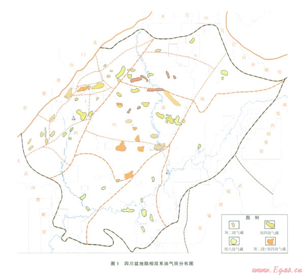 近60年在四川盆地對(duì)陸相層系的油氣勘探取得了大量成果,發(fā)現(xiàn)油氣田60余個(gè)(圖1),探明天然氣儲(chǔ)量約7 000×108m3,顯示出四川盆地陸相層系具有“多套砂巖油氣層與頁(yè)巖氣層交叉疊置、滿盆分布”的特點(diǎn),砂巖油氣和頁(yè)巖氣兼顧立體勘探格局將向全盆地展開,前景十分廣闊。