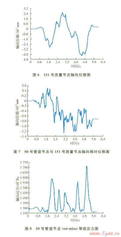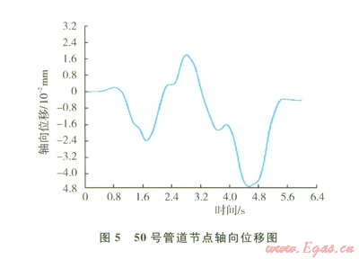 圖8顯示了管道50號節(jié)點(diǎn)von-mises等效應(yīng)力在整個爆破地震波作用周期內(nèi)的變化趨勢,在第4.8 s時管道中間節(jié)點(diǎn)應(yīng)力達(dá)到170 MPa,仍然處于彈性階段。由于描述地震破壞作用的主要參數(shù)是軸向應(yīng)變,而此算例的軸向應(yīng)變最大值為0.0011,與采用抗震規(guī)范法中計算出的最大軸向應(yīng)變?yōu)?span lang="EN-US">0.001 3極為接近,也證明了模擬結(jié)果的準(zhǔn)確性。
