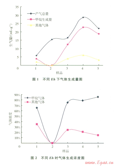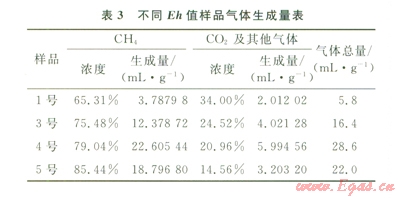 筆者在實驗室條件下模擬了不同Eh條件下生物甲烷生成的情況,對不同條件下產(chǎn)出的氣體及甲烷含量進行分析,并對甲烷在不同反應階段的生成方式進行了探討,實驗結(jié)果表明: