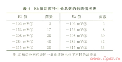 3)Eh值對菌種總量的影響。實驗結(jié)束后對反應瓶中的細菌進行接種培養(yǎng),并采用活菌計數(shù)法對菌種量進行計數(shù)得出表4。