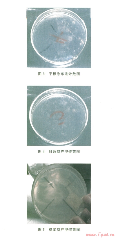 從接種培養(yǎng)的結(jié)果可以看出,細菌的生長個數(shù)與氧化還原電位有一定的關(guān)系,在高氧化還原電位時產(chǎn)甲烷菌的數(shù)量較少,隨著氧化還原電位的降低,基本趨勢是細菌生長的個數(shù)越來越多。由此認為,氧化還原電位是產(chǎn)甲烷發(fā)酵的重要限制因子,較低的適合的氧化還原電位可以促進產(chǎn)甲烷菌體內(nèi)的酶系的活性,使其調(diào)整代謝方式和速率,加快生長繁殖。另對-284mV的氧化還原電位值的產(chǎn)甲烷菌進行為期90d的培養(yǎng)觀察,菌種的平板培養(yǎng)結(jié)果如圖3~5所示。