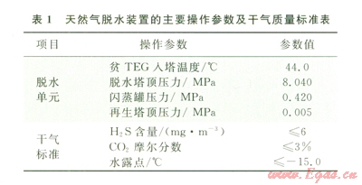目前,國內(nèi)天然氣脫水主要采用三甘醇(TEG)脫水法,川渝地區(qū)某天然氣凈化廠600×104 m3/d天然氣脫水裝置也采用典型的TEG脫水法脫除來自脫硫單元凈化濕氣中的水分,以降低天然氣的露點。表l為該天然氣脫水裝置的主要操作參數(shù)及干氣標(biāo)準(zhǔn)。圖2為該天然氣脫水裝置的工藝流程圖。