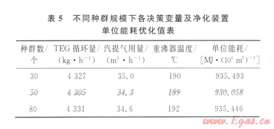 然后,分別在30、50和80個種群規(guī)模下運行優(yōu)化程序。表5所示為不同種群規(guī)模下各決策變量及凈化裝置單位能耗優(yōu)化值。