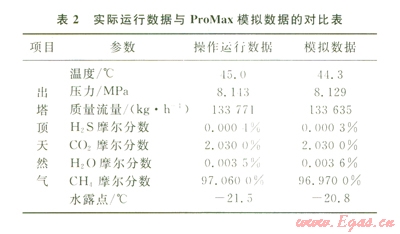 依據(jù)該天然氣脫水裝置的運行數(shù)據(jù),將各原料氣及TEG的參數(shù)輸入脫水裝置工藝模型,調(diào)整模型各 個參數(shù),使模擬數(shù)據(jù)與實際運行數(shù)據(jù)達(dá)到基本吻合,使輸出的凈化產(chǎn)品氣到達(dá)凈化干氣的氣質(zhì)標(biāo)準(zhǔn)。表2為實際運行數(shù)據(jù)與ProMax模擬數(shù)據(jù)對比衷,據(jù)此來驗證所建立ProMax模型的準(zhǔn)確性。