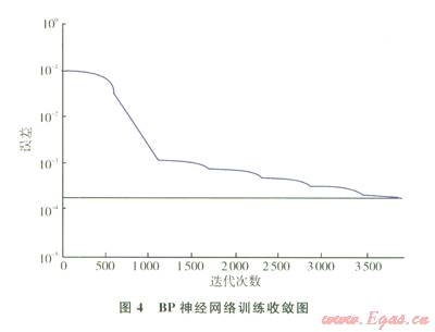 由圖4可知BP神經(jīng)網(wǎng)絡(luò)的收斂性良好,說明程序的下一步預(yù)測有效。表3為BP神經(jīng)網(wǎng)絡(luò)預(yù)測值與實際值的對比和誤差。