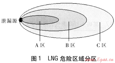LNG蒸發(fā)達(dá)到一定濃度時(shí),可能危及人的生命安全,遇到明火,甚至?xí)a(chǎn)生爆炸。本評(píng)價(jià)根據(jù)LNG蒸氣擴(kuò)散到不同濃度時(shí)造成危害程度的大小,將LNG擴(kuò)散的危險(xiǎn)區(qū)域劃分為3個(gè)區(qū)。爆炸危險(xiǎn)區(qū)(A區(qū)):LNG蒸氣濃度高于爆炸下限,遇明火產(chǎn)生爆炸;嚴(yán)重?fù)p害區(qū)(B區(qū)):LNG蒸氣濃度較高,可能造成人員急性中毒甚至死亡;輕度損害區(qū)(C區(qū)):LNG蒸氣濃度可引起人員不良反應(yīng),造成輕度中毒或吸入反應(yīng)。3個(gè)區(qū)域的關(guān)系見圖1。