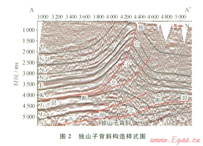 圖2顯示了獨(dú)山子北斷裂沿白堊系吐谷魯群泥巖層滑脫,向上突破進(jìn)入古近系地層,控制了獨(dú)山子背斜斷層傳播褶皺的發(fā)育。獨(dú)山子背斜中淺層為典型的斷層傳播褶皺。其特點(diǎn)為:①背斜后翼模擬下盤(pán)斷坡產(chǎn)狀;②形成向斷層運(yùn)動(dòng)方向傾倒的不對(duì)稱(chēng)背斜;③常有突破斷層發(fā)育;④突破斷層位移量很小[4]。