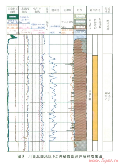 K2井位于川西北部的礦山梁構(gòu)造,該區(qū)地處四川盆地西北部的龍門山和米倉山交匯三角地帶,該區(qū)曾經(jīng)經(jīng)歷了多期次的構(gòu)造運(yùn)動,地面斷層、油砂巖比比皆是。在地質(zhì)歷史時期,由于斷層的開啟、閉合不斷對平衡了的油氣藏進(jìn)行調(diào)整、改造及破壞。斷層的活動一方面提供了油氣調(diào)整的動力,另一方面也將地表的淡水帶入儲層,油氣運(yùn)移出去后,水滯留在儲層內(nèi),從而導(dǎo)致儲層電阻率受地層水控制明顯。因此在斷層附近或者保存條件較差的地區(qū)進(jìn)行儲層流體解釋時,應(yīng)考慮地表水的滲入,避免因淡水滲入儲層形成高阻水層的氣層假象特征。