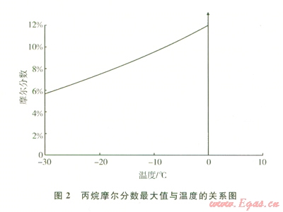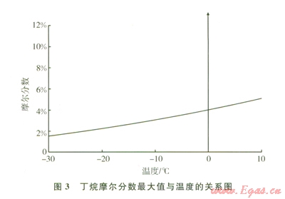 根據(jù)“壓縮天然氣汽車燃料推薦做法”(SAEJ1616-1994)的規(guī)定,新版ISO 15403-1-2006推薦在可能達到的最低環(huán)境溫度和最高操作(或儲存)壓力下,CNG中冷凝液態(tài)烴的總量應(yīng)不超過1%(摩爾分數(shù))。壓力在6 000~10 000 kPa范圍內(nèi)要求冷凝液態(tài)烴總量不超過l%時,不同溫度下CNG中相應(yīng)的最大丙烷和丁烷含量分別如圖2、3所示。