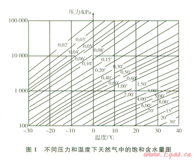 同時,在新版ISO/TR l5403-2-2006的附錄E中列出了如圖l所示的不同壓力和溫度下天然氣中的飽和含水量,此圖是根據(jù)“天然氣水含量與水露點之間的關(guān)聯(lián)”(GB/T 22634-2008、ISO 18453-2004)制作的。圖1表明:天然氣中含水量小于30 mg/m3時,在25 MPa高壓下,其水露點低于-l3℃。這對于中國大部分地區(qū)均適用。