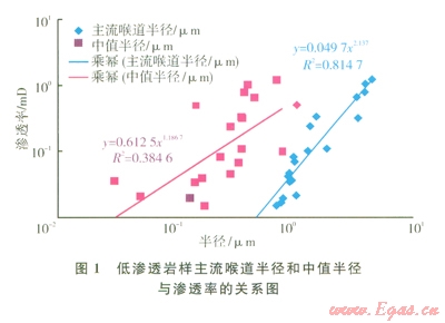 喉道大小及分布是控制儲層滲流能力的關鍵。定義對滲透率累積貢獻達95%以前喉道半徑的加權平均值為主流喉道半徑。須家河組不同儲層巖樣主流喉道半徑和中值半徑與滲透率關系表明(圖1),主流喉道半徑隨滲透率的增加而增加,二者之間存在非常好的正相關關系;但是中值半徑與滲透率之間的相關性較差。這說明主流喉道半徑不僅能表征儲層基質的滲透能力,而且能夠反映儲層微觀孔隙結構特征。