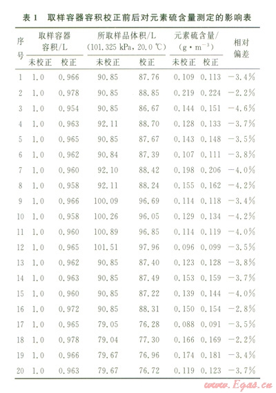 為了保證取樣時取樣容器中不含影響測定準(zhǔn)確性的水和氧氣等干擾物,在取樣前對容器進(jìn)行干燥和無氧化處理是非常重要的。同時由于計算元素硫含量時,需要掌握樣品在標(biāo)準(zhǔn)參比條件(我國為101.325kPa,20.0℃)下的體積。而天然氣樣品是采集在壓力下的取樣容器中的,當(dāng)已知取樣容器的容積、樣品的壓力和氣體在壓力下的壓縮岡子,根據(jù)氣體狀態(tài)方程,可計算天然氣樣品在標(biāo)準(zhǔn)參比條件下的體積。因此,如何準(zhǔn)確測定取樣容器的容積是實(shí)施測定前必須考慮的關(guān)鍵因素之一。表l為取樣容器進(jìn)行容積校正前后對元素硫測定結(jié)果的影響程度。可以看出,取樣容器未校正元素硫含量值比校正元素硫含量值低2%~5%。