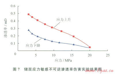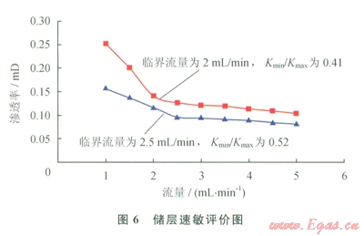 2)中等速敏和壓力敏感損害:儲(chǔ)層巖心液測(cè)速敏實(shí)驗(yàn)表明,在1~5mL/min的測(cè)定流量范圍內(nèi),巖心的最小滲透率Kmin和最大滲透率Kmax分別為0.1029mD、0.2514mD和0.08mD、0.155mD,臨界流量為2~2.5mL/min,Kmin/Kmax分別為0.41、0.52,液測(cè)速敏損害較強(qiáng)(圖6)。儲(chǔ)層巖心應(yīng)力敏感實(shí)驗(yàn)結(jié)果由實(shí)驗(yàn)結(jié)果可知:該地區(qū)低滲透儲(chǔ)層的應(yīng)力敏感性為中等損害,滲透率由0.49mD降低為應(yīng)力變化后的0.275mD,其應(yīng)力敏感引起的不可逆滲透率損害率為43.9%(圖7)。
