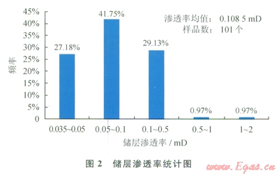 根據(jù)砂巖儲(chǔ)層孔隙度、滲透率與最大孔喉半徑的關(guān)系,該區(qū)塊儲(chǔ)層滲透率主要分布在0.035~0.5mD,占98.06%,主要孔喉半徑分布在O.1~0.8mm;儲(chǔ)層最大滲透率范圍在0.5~2mD,其對(duì)應(yīng)的最大孔喉半徑范圍0.8~3.0mm,該儲(chǔ)層對(duì)滲透率貢獻(xiàn)率最大的孔喉半徑區(qū)間為0.1~0.8mm和0.8~3.0mm。