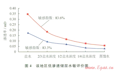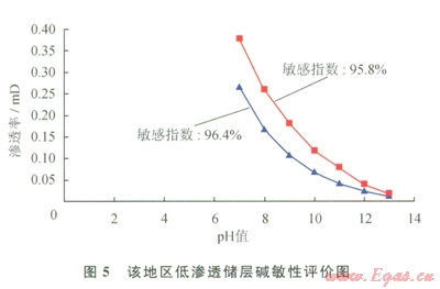 1)儲(chǔ)層巖心具有較強(qiáng)的水鎖、水敏和堿敏損害特征:根據(jù)對(duì)該地區(qū)低滲透儲(chǔ)層段含水飽和度的統(tǒng)計(jì),其儲(chǔ)層段含水飽和度平均為64.81%,對(duì)照實(shí)驗(yàn)結(jié)果,儲(chǔ)層段受到中等偏強(qiáng)水鎖損害(表1)。儲(chǔ)層段巖心水敏性實(shí)驗(yàn)表明,滲透率分別由0.3485mD降至0.0572mD、由0.1750mD降至0.0292mD,巖心的敏感指數(shù)分別為83.6%和83.3%,說(shuō)明該地區(qū)低滲透儲(chǔ)層段具有強(qiáng)水敏性(圖4)。儲(chǔ)層段巖心堿敏評(píng)價(jià)實(shí)驗(yàn)結(jié)果表明,當(dāng)pH值由7升至l3時(shí),巖心滲透率分別南0.3762mD降至0.0158mD、由0.2639mD降至0.0095mD,巖心的堿敏感指數(shù)分別為95.8%和96.4%,該地區(qū)低滲透儲(chǔ)層具有強(qiáng)的堿敏性(圖5)。