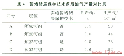 針對(duì)研究的四川油氣田某區(qū)塊須家河組儲(chǔ)層,須家河組儲(chǔ)層段中的2口開(kāi)發(fā)井實(shí)施多級(jí)架橋暫堵儲(chǔ)層保護(hù)技術(shù)前后的油氣產(chǎn)量對(duì)比(表4)。實(shí)施多級(jí)架橋暫堵儲(chǔ)層技術(shù)的2口開(kāi)發(fā)井,其油氣產(chǎn)量得到明顯提高,充分說(shuō)明多級(jí)架橋暫堵技術(shù)對(duì)值層具有良好的保護(hù)作用。