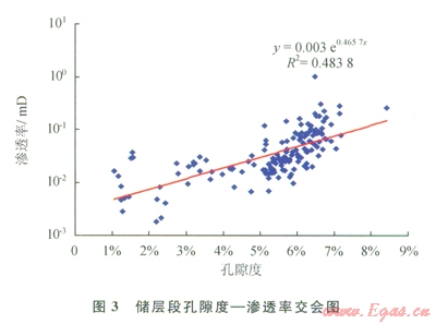 通過(guò)對(duì)該地區(qū)儲(chǔ)層段巖樣統(tǒng)計(jì)分析表明,儲(chǔ)層孔隙度主要集中分布在6%~8%(圖1),平均孔隙度為6.72%;儲(chǔ)層段樣品滲透率主要集中在0.035~0.5mD,占98.06%(圖2),平均滲透率為0.1085mD。儲(chǔ)層孔隙度和滲透率二者存在較好的指數(shù)相關(guān)性,R達(dá)到0.6988,滲透率隨孔隙度增大而增大(圖3)。因此,該區(qū)儲(chǔ)層屬于低孔、低滲透性儲(chǔ)層。