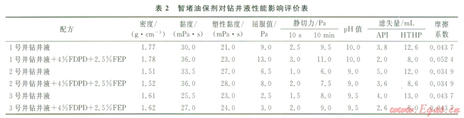 為考察暫堵油保劑加入后鉆井液性能的變化,采用了該地區(qū)現(xiàn)場(chǎng)鉆井液加入4%FDPD多級(jí)架橋暫堵粒子和2.5%FEP可變形軟化粒子前后的流變性能對(duì)比實(shí)驗(yàn)(表2)。