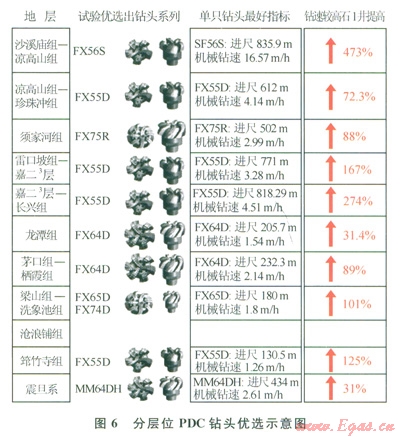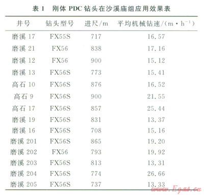 通過試驗(yàn)與優(yōu)化改進(jìn)PDC鉆頭,逐步優(yōu)選出適應(yīng)各層位的PDC鉆頭型號(圖6),機(jī)械鉆速和單只鉆頭進(jìn)尺大幅度提高,第二批正鉆井在沙溪廟地層試驗(yàn)剛體PDC鉆頭取得新進(jìn)展,平均機(jī)械鉆速由傳統(tǒng)胎體PDC鉆頭7.24m/h提高到16.27m/h(表1),已接近空氣鉆進(jìn)效果。