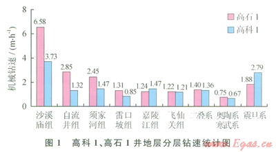 海相地層占全井進(jìn)尺的57%(約3000m),巖石強(qiáng)度高,硅質(zhì)含量重,部分層段含燧石結(jié)核和角礫云巖,機(jī)械鉆速極低,高科1井、高石l井各地層平均機(jī)械鉆速統(tǒng)計(jì)如圖1所示,不能采用氣體鉆提速的陸相碎屑巖地層的平均機(jī)械鉆速小于2.50m/h,嚴(yán)重影響了全井鉆井速度。