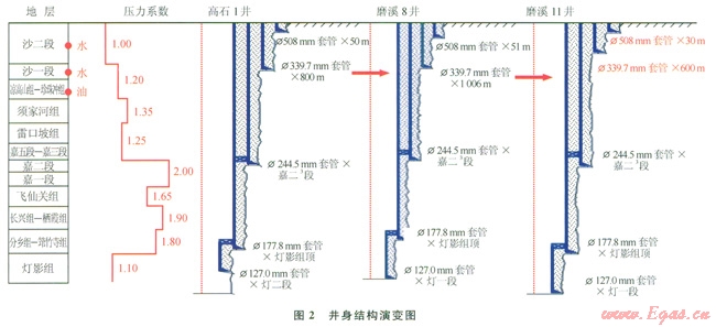 第二輪井的井身結(jié)構(gòu)設(shè)計(jì)以地層3個(gè)壓力剖面為依據(jù),在充分分析地質(zhì)條件后,對Æ339.7mm表層套管下深進(jìn)行了合理調(diào)整至500~600m(圖2中的磨溪11井),縮短了Æ444.5mm井眼段進(jìn)尺300~500m,確保Æ311.2mm井眼在鉆遇氣層后具備一定的井控能力,實(shí)施后的施工周期同比節(jié)約了6~7d。