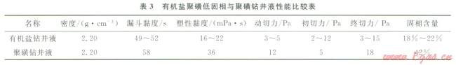 表3為有機(jī)鹽聚磺低同相與聚磺鉆井液性能比較數(shù)據(jù),采用有機(jī)鹽加重劑配制的有機(jī)鹽聚磺低固相鉆井液,與單獨(dú)采用重晶石加重配制的聚磺鉆井液配相比,其流變性更好,固相含量更低,有利于改善鉆頭研磨巖石的井底工作環(huán)境,提高機(jī)械鉆速。