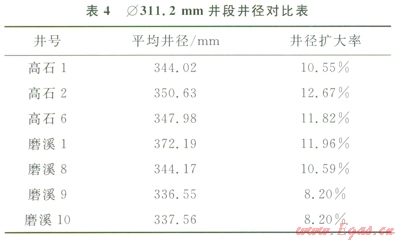 有機(jī)鹽鉆井液體系在高石2井、高石6井、磨溪8井、磨溪9井、磨溪l0井的Æ311.2mm井段和Æ215.9mm井段現(xiàn)場應(yīng)用。表4為高石2、高石6、磨溪8、磨溪9、磨溪l0井Æ311.2mm井段應(yīng)用有機(jī)鹽鉆井液的平均井徑對比數(shù)據(jù),轉(zhuǎn)換為有機(jī)鹽體系后的滾動(dòng)回收率均提高,機(jī)械鉆速明顯提高,平均井徑擴(kuò)大率明顯降低(表4),高石2井等井由于上部氣體鉆形成的大井徑,造成井徑擴(kuò)大率偏高。
